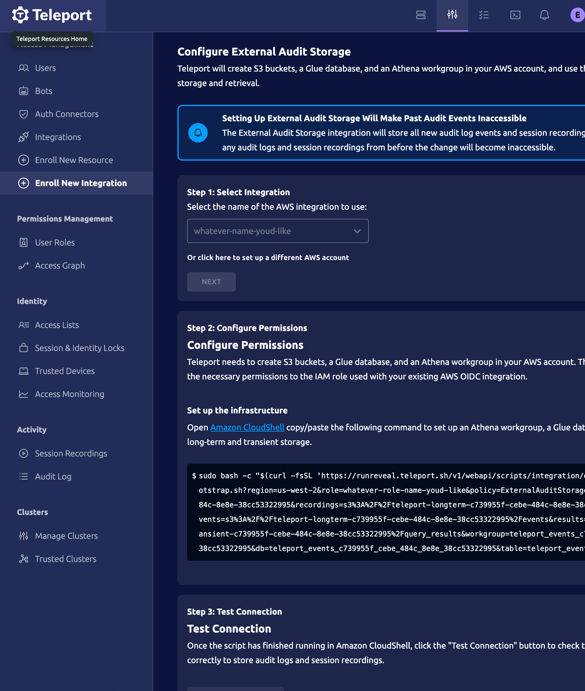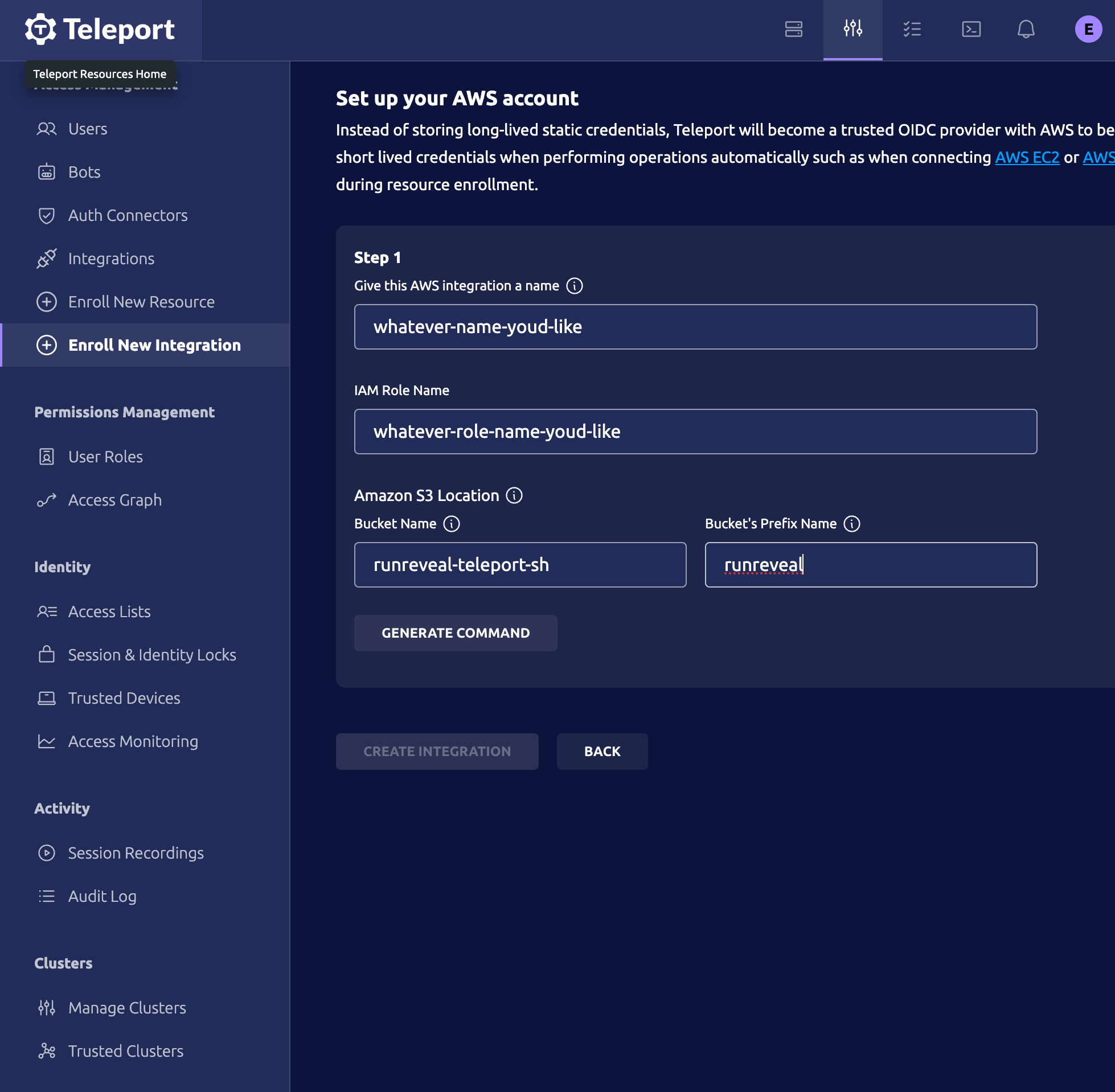 As part of the setup process, you’ll provide teleport with a name for your integration, the iam role name you’d like for teleport to create, the bucket name you’d like teleport to create, and the bucket prefix.